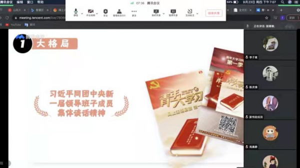 为响应共青团中央的号召,部署全团开展“青年大学习”行动,推动习近平新时代中国特色社会主义思想在青年中入脑入心,使广大团员青年真正认识到理论武装和思想进步的现实意义,更加自觉地参与到青年大学习当中,展现新时代青年的青春风采,2021年9月23日,tyc8722太阳集团城2021级全体新生、团委组织委员、团支部书记、青年大学习工作联络员等参与了由tyc8722太阳集团城校团委组织开展的 “青年大学习”主题团课。