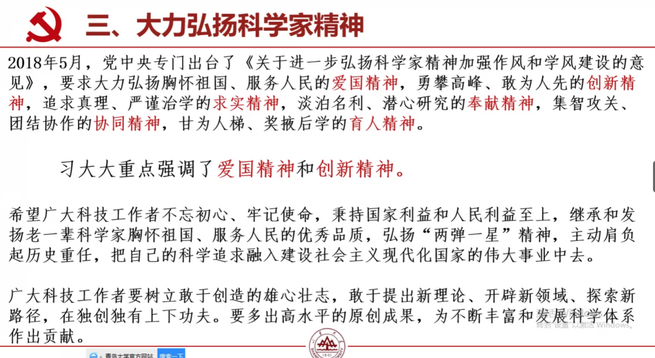会前,支部成员自学了《习近平在科学家座谈会上的讲话》及人民日报评论员、新华社评论员、光明日报评论员的三篇评论文章。会上,戴永洁带领与会成员再次深入学习重要讲话内容,分别从充分认识加快科技创新的重大战略意义、加快解决制约科技创新发展的一些关键问题与大力弘扬科学家精神三个方面进行深刻解读,她认为,疫情期间正是众多科技工作者的努力,促成我们初步打赢疫情攻坚战,作为学生也应该以他们为榜样,牢记爱国信念,在学习中注重与实际生活、现实需求相结合,挖掘自己研究中的理论价值和现实意义,更好地为社会服务。