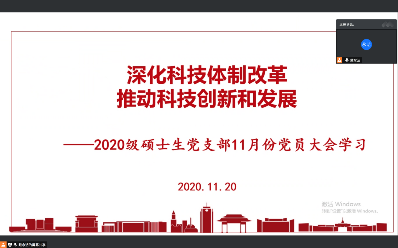 2020年11月20日上午,2020级硕士生党支部于腾讯会议召开党员大会,进行专题学习,此次学习的主题是:深化科技体制改革,推动科技创新和发展。活动由党支部书记戴永洁主持领学,支部全体党员参加。